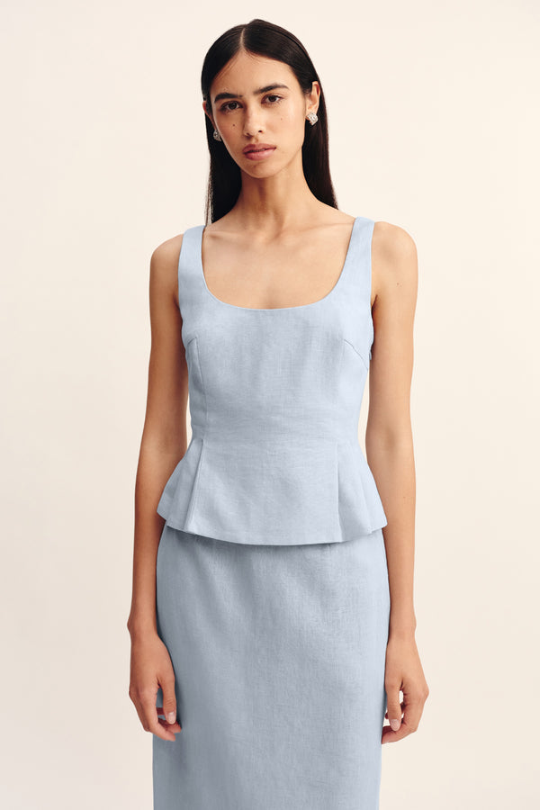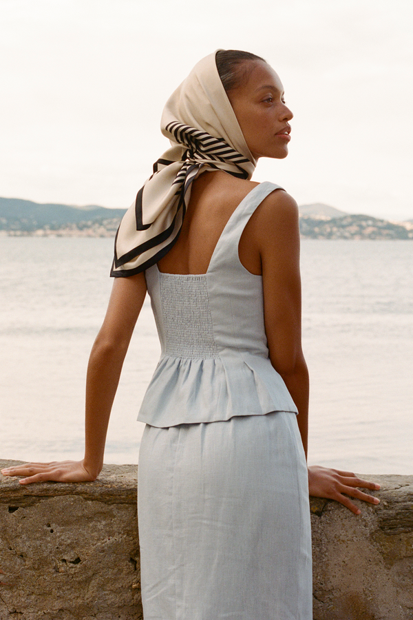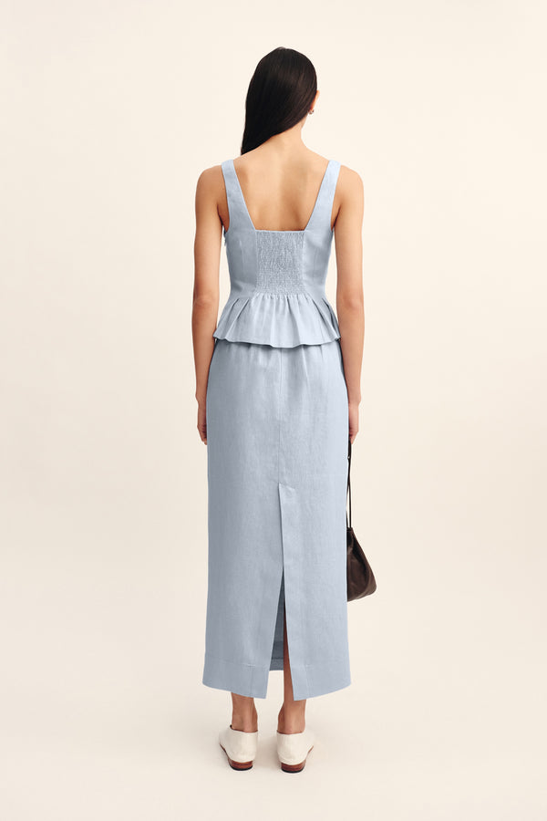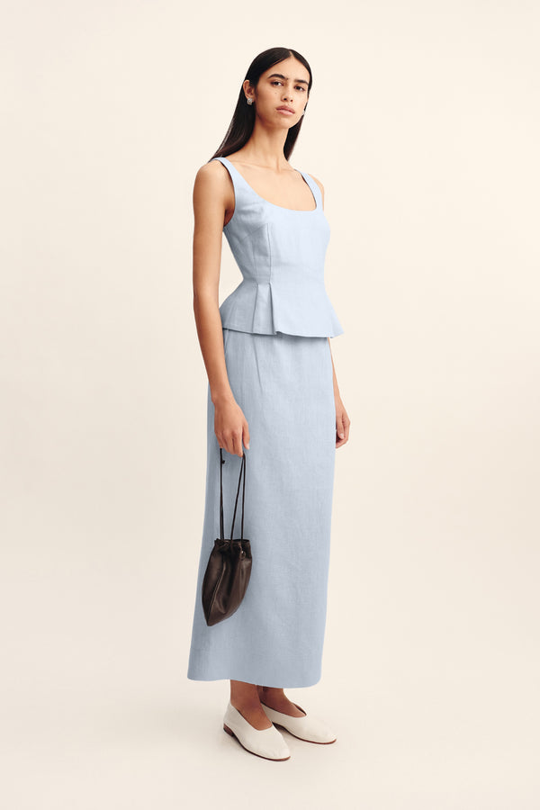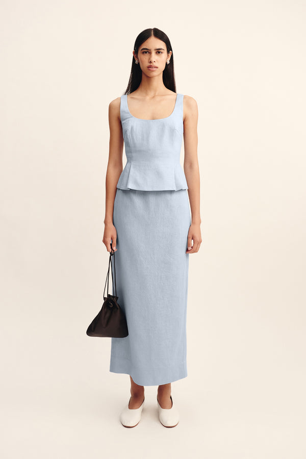 The Emma Pencil Skirt is cut from premium linen in a sleek column silhouette that falls effortlessly to a maxi hem. It sits comfortably on the high-rise waist and features a subtle black split to ensure ease of movement.